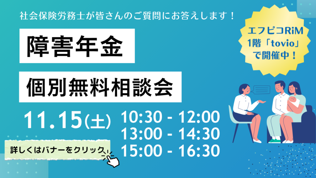 - 5月 8, 2025エフピコRiM(リム) 1階「tovio」にて障害年金の無料相談会を実施します!