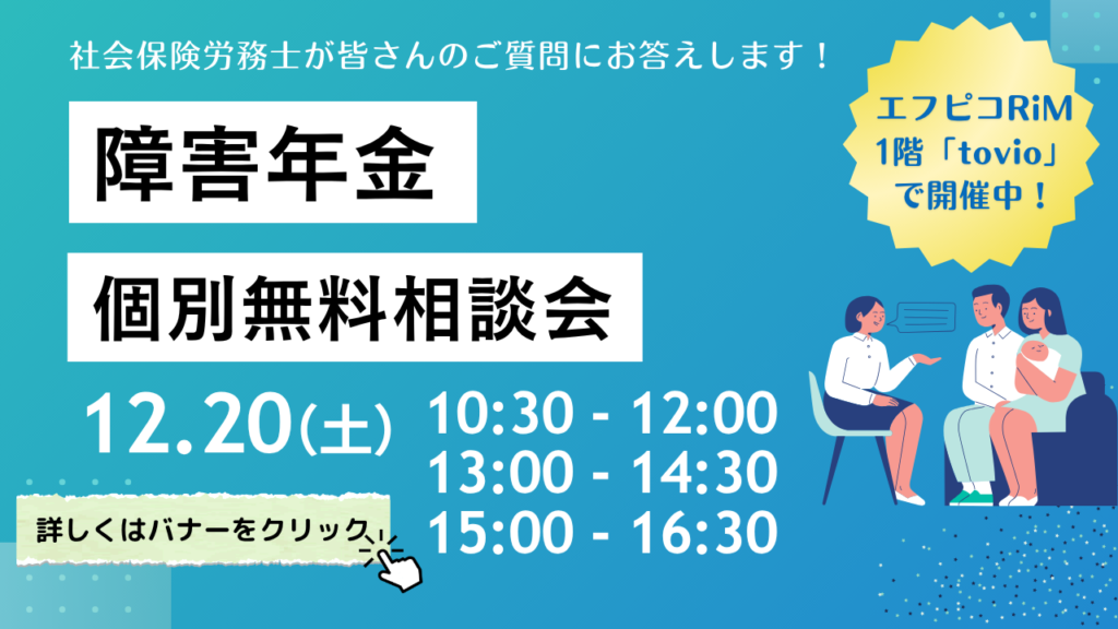 - 5月 8, 2025エフピコRiM(リム) 1階「tovio」にて障害年金の無料相談会を実施します!